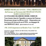Next tuesday 12th July we are having our third summer soiree - this time we are fortunate enough to have the English Chamber Choir from London who are going to be performing in the vineyard and around the chateau. The evening starts at the cave and centres around our 6 wines and 6 perfectly matched cheeses from Claudine Vigier at the Fromagerie du Comtat in Carpentras. It then progresses with … [Read more...]