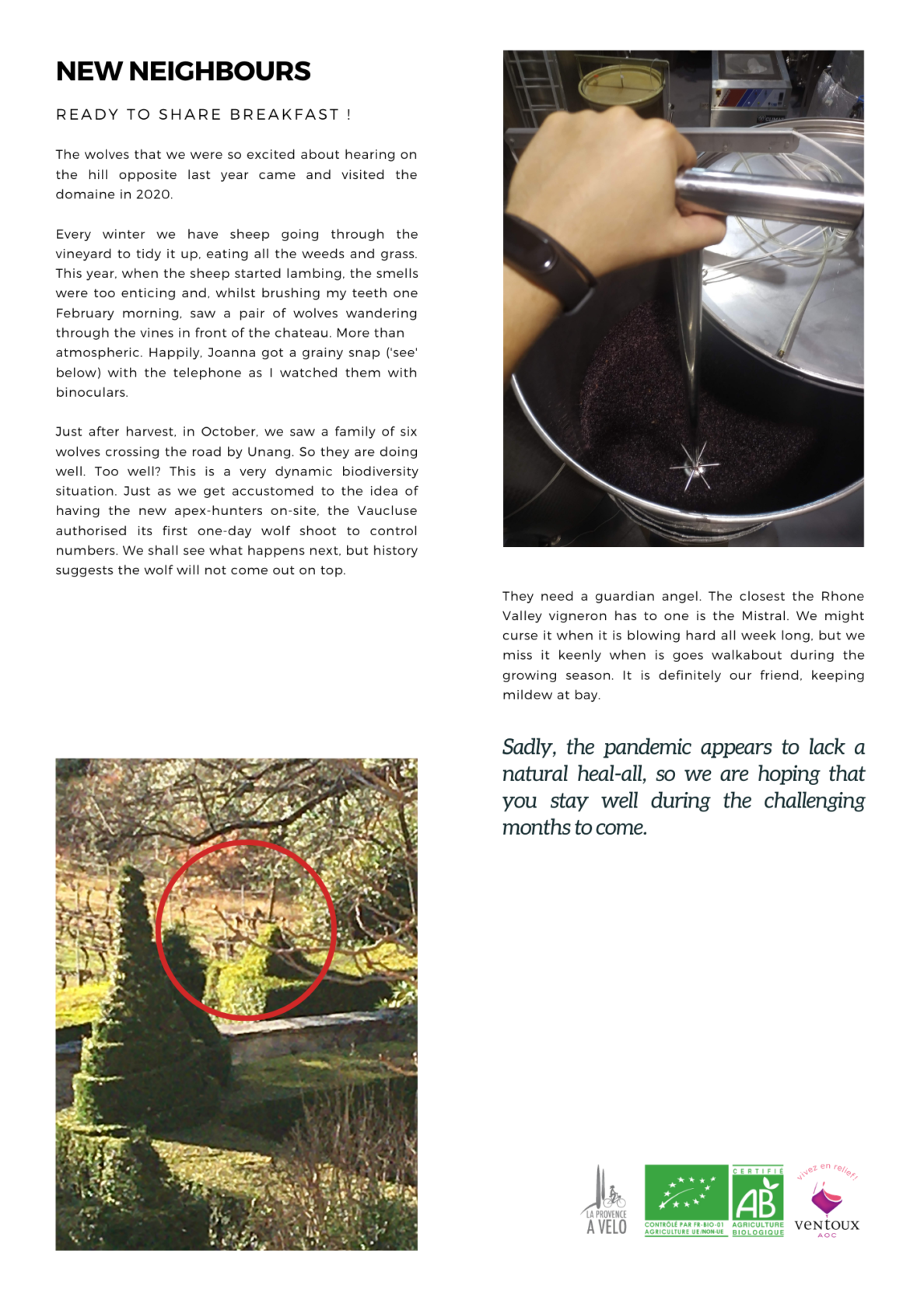 Always interesting to read about life and harvest at Chateau Unang. And now that the wolves have been noticed I wonder how the situation will develop. Beautiful animals, smart and with a well definated social rang. Hopefully this will not create situations of danger or killing of sheeps.